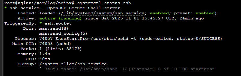 service ssh startIt's important that the SSH server is started when the LXC is rebooted. Run the below command to enable this.